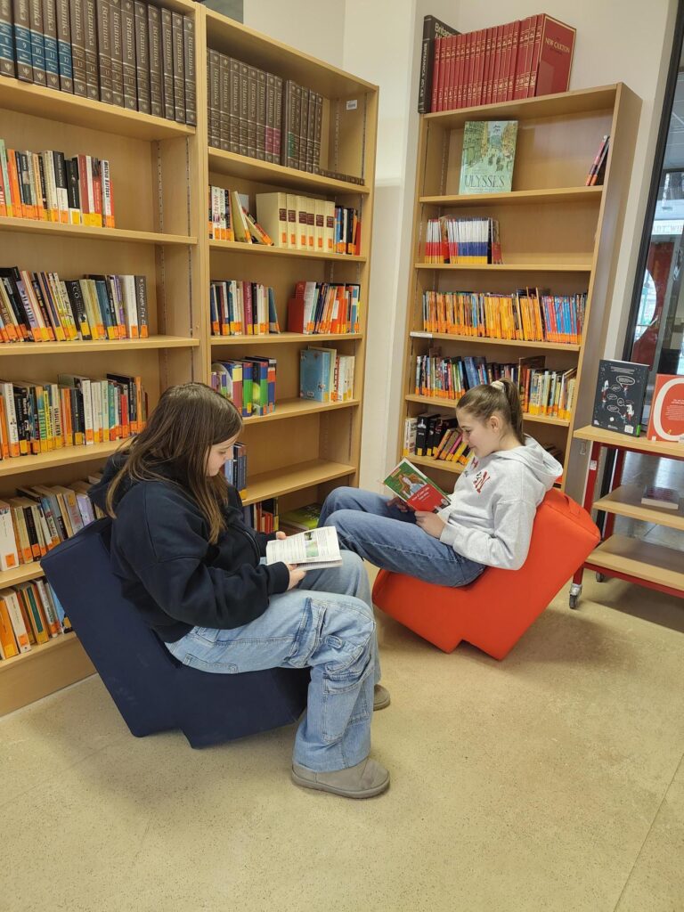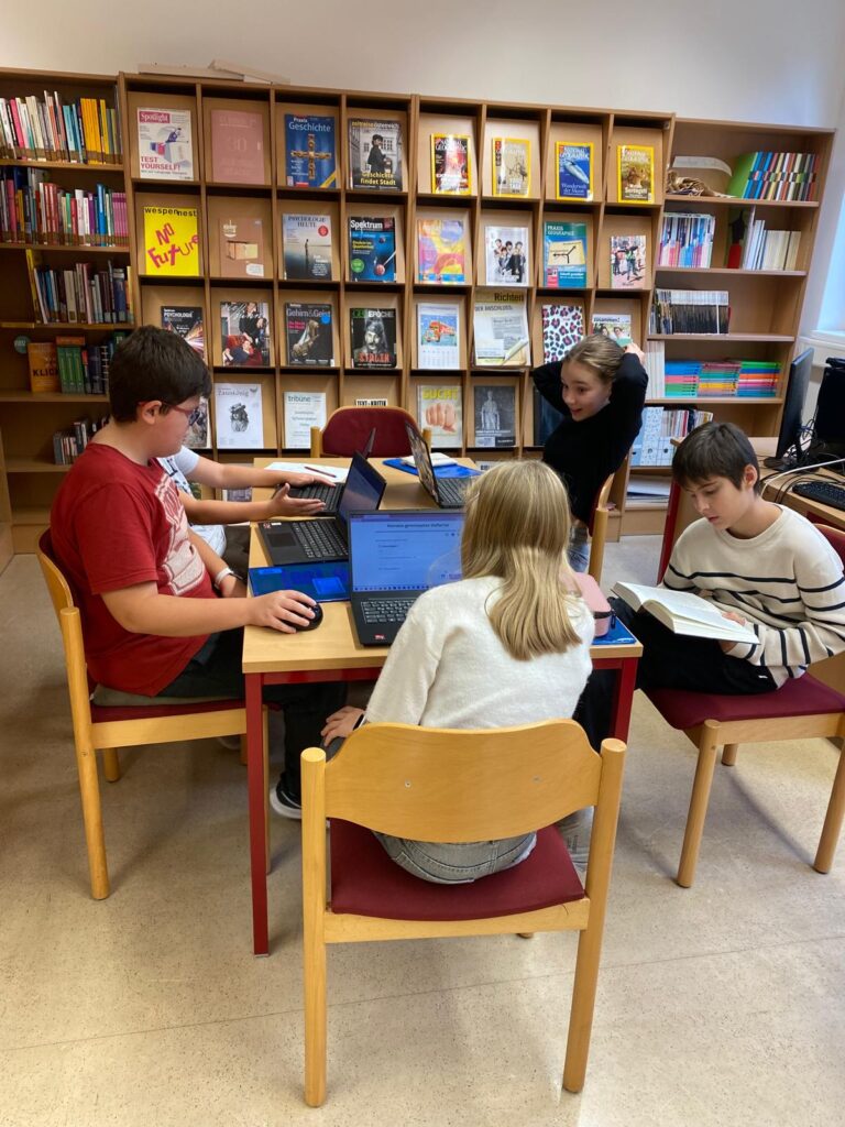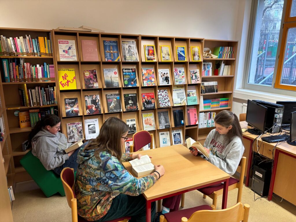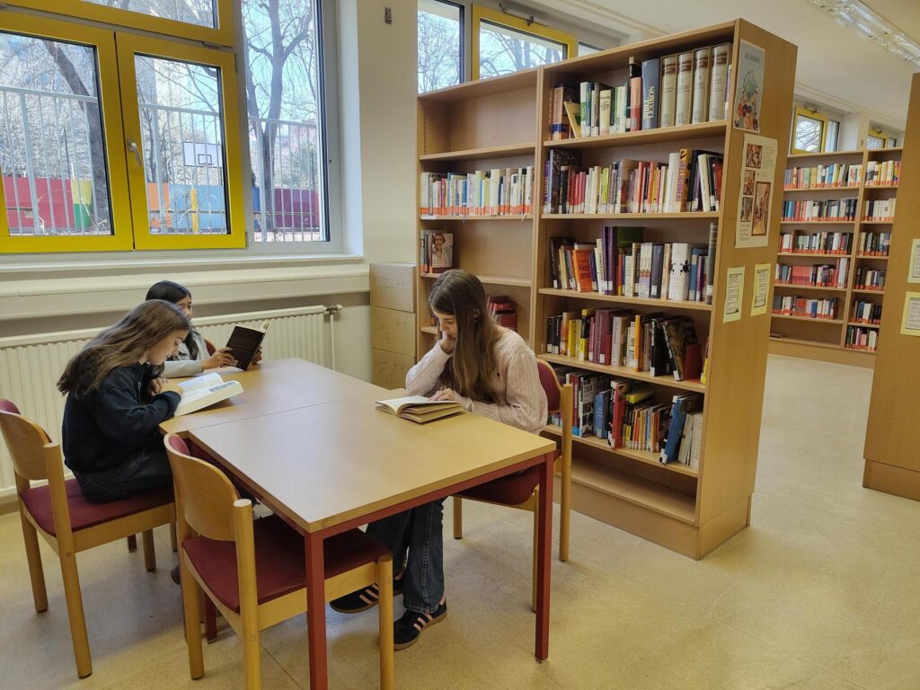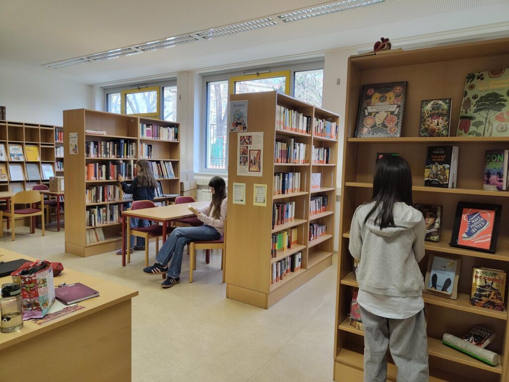 In unserer schönen Schulbibliothek finden regelmäßig Unterrichtseinheiten statt, sie wird auch gerne für individuelle Lektüre im Rahmen der Tagesbetreuung genutzt.
